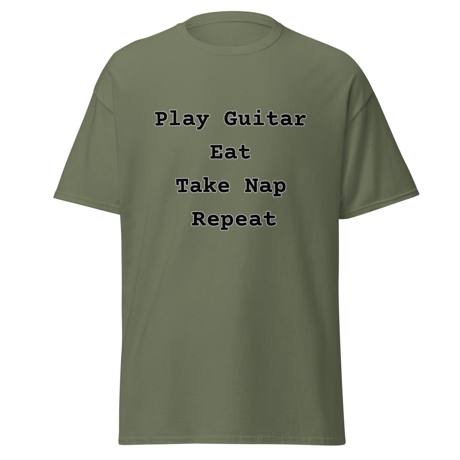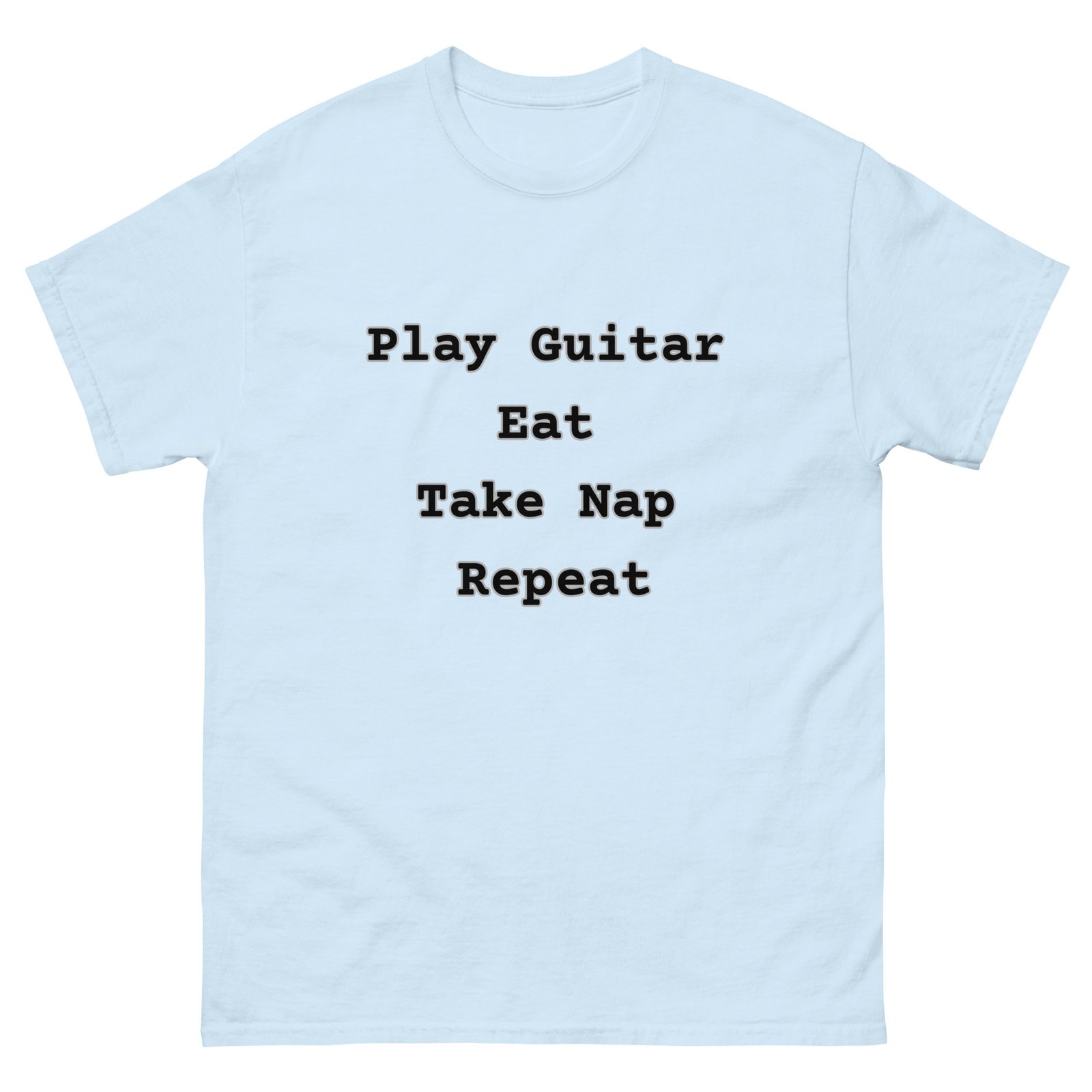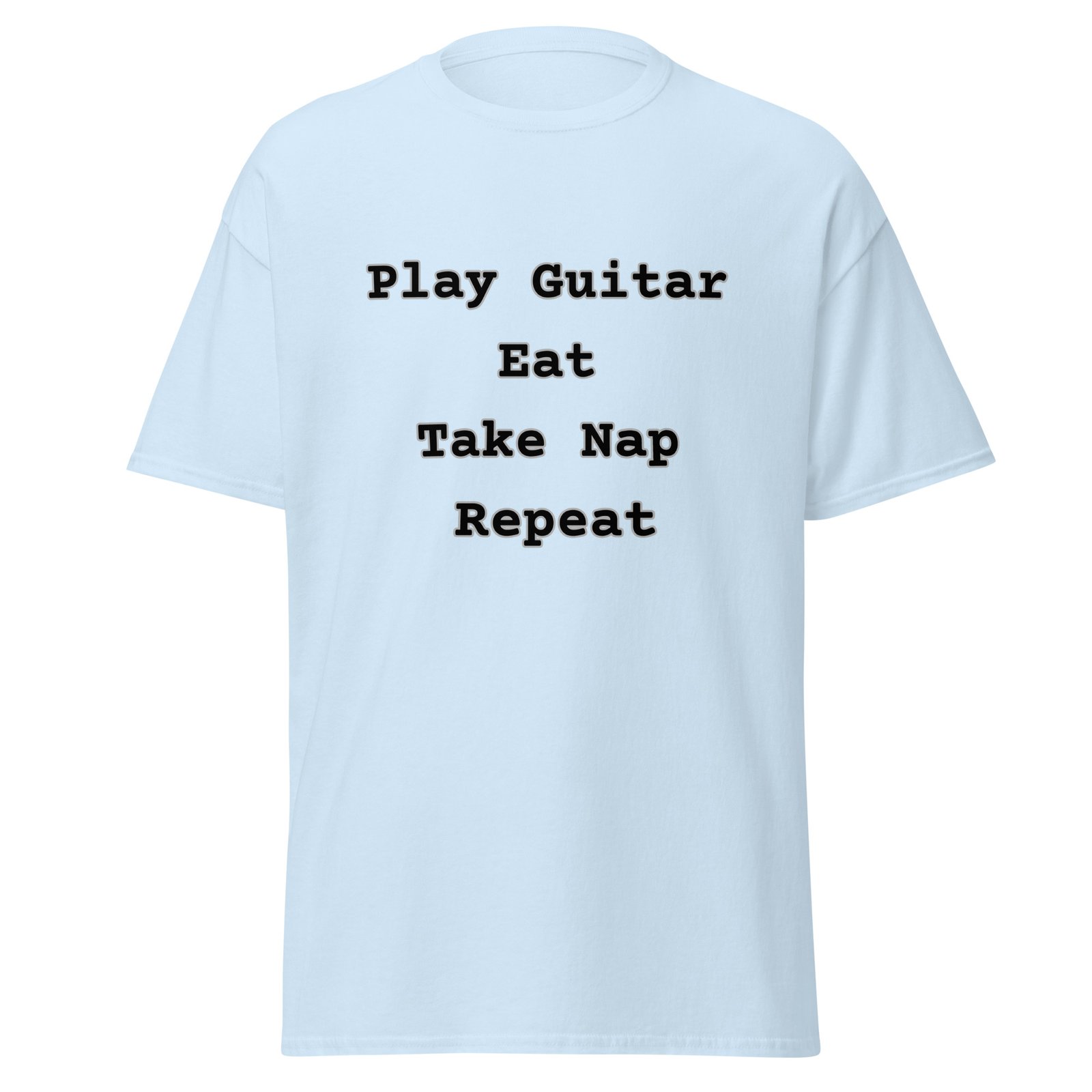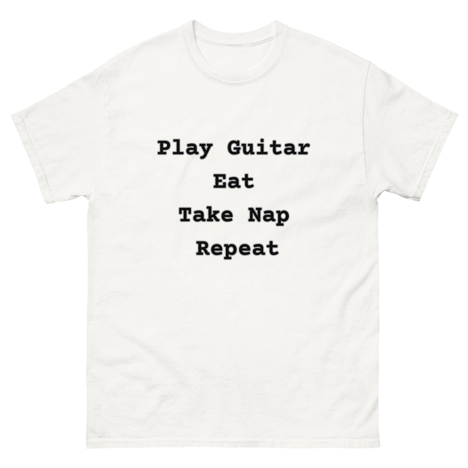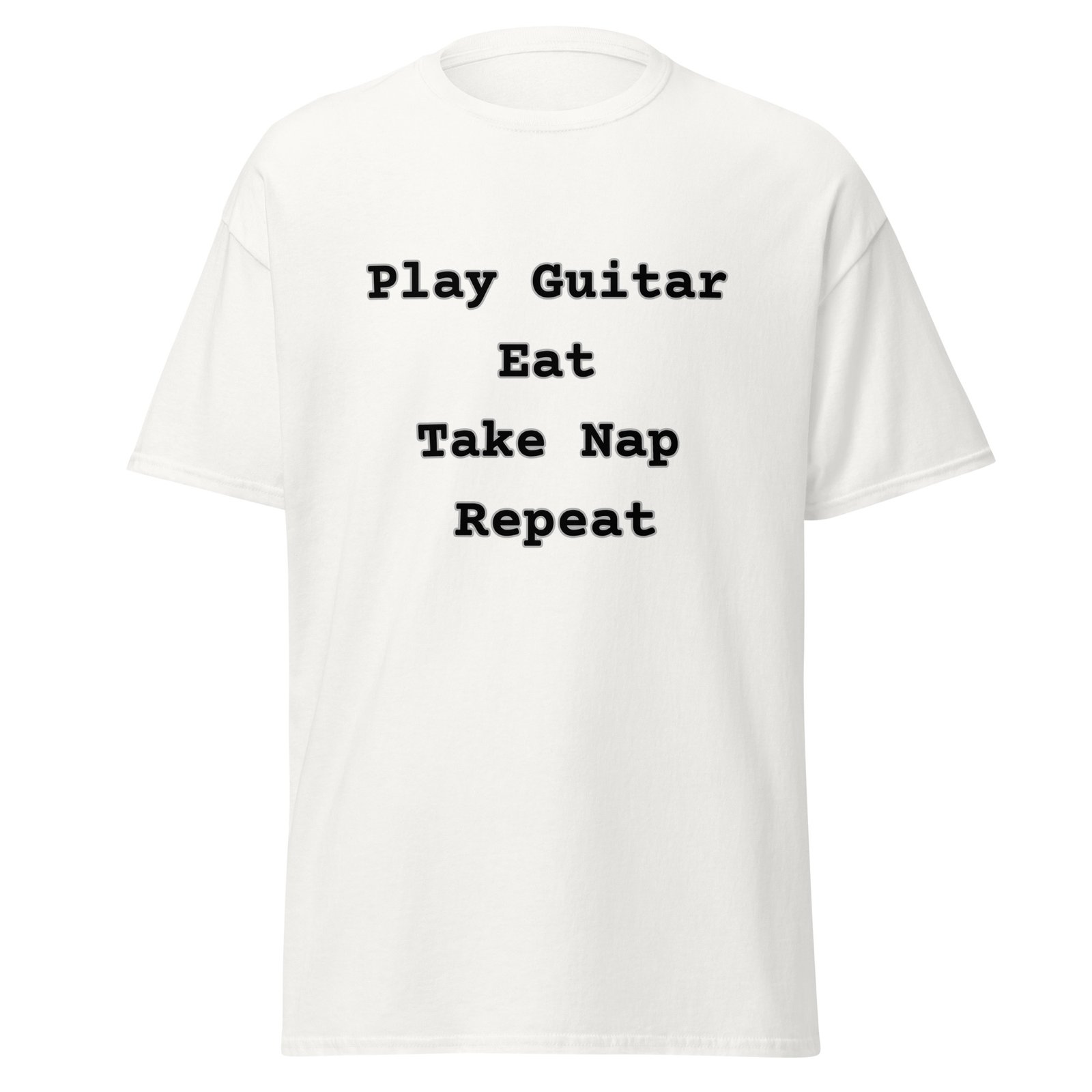 Do you have a simple, pure love for the guitar and the essential things in life? Then you understand the rhythm of this routine! Introducing the must-have T-shirt and Sweatshirt for every serious—or seriously laid-back—guitar player!